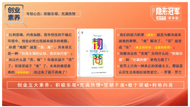 在本次課程的最后,樓仲平老師鼓勵大家不要悲觀,因為人類就是在充滿波折和螺旋的周期中成長,從而不斷遇見更強大優(yōu)秀的自我!所以在創(chuàng)業(yè)五大素養(yǎng)中,樓老師認為“積極樂觀”是最重要的素養(yǎng)。