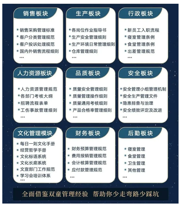 所以,入學(xué)“隱形冠軍樓仲平思享薈”之后,項目組會將“雙童”積累了30年、包含了銷售、生產(chǎn)、行政、人力資源、品質(zhì)、安全、文化管理、財務(wù)和后勤等9大板塊,近600份管理規(guī)范文件,全部打包給學(xué)員,幫助學(xué)員企業(yè)能夠全面借鑒雙童管理經(jīng)驗、少走彎路、少踩坑!