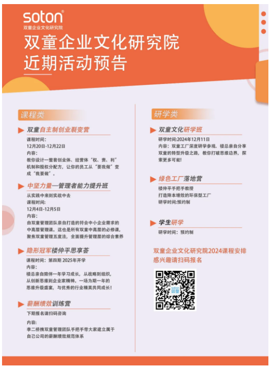 近期,“雙童”又將迎來阿里國際站研學(xué)活動,來自全國各地的商家將從“雙童”這一行業(yè)標(biāo)桿中汲取寶貴的成功經(jīng)驗(yàn)和創(chuàng)新理念,并深度學(xué)習(xí)“雙童”這家中小企業(yè)如何在數(shù)字化浪潮中乘風(fēng)破浪,通過持續(xù)的技術(shù)革新與思維轉(zhuǎn)換,實(shí)現(xiàn)“輕松管理、無為而治、解放自己”!