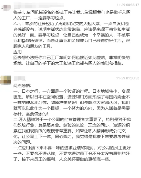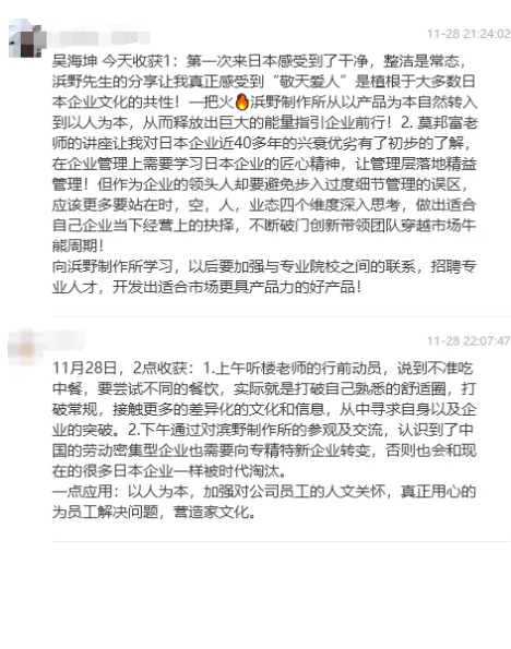 所以,在第一天的研學(xué)結(jié)束之后,同學(xué)們不僅收獲了很多關(guān)于產(chǎn)品創(chuàng)新、精細(xì)化管理等企業(yè)經(jīng)營的新靈感,對(duì)自身企業(yè)未來的經(jīng)營方向也有了不一樣的感觸: