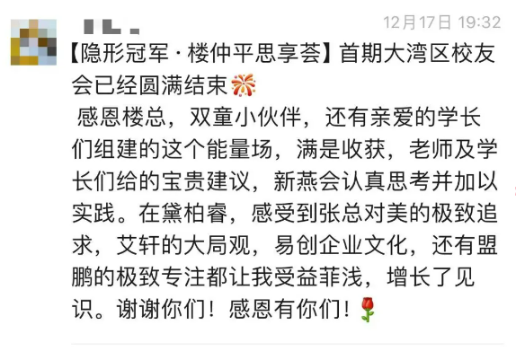 一直以來,樓仲平【思享薈】最珍貴的東西除了知識(shí),還有一個(gè)最讓人動(dòng)容的東西就是校友們的真情!每一次相聚,都像是闊別重逢的老友,無論是在雙童,還是在大灣區(qū)校友會(huì)晚宴上,大家都能把酒言歡,都有說不盡的言語!