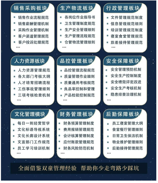 所以,入學(xué)“隱形冠軍樓仲平思享薈”之后,項(xiàng)目組會(huì)將“雙童”積累了30年、包含了銷售、生產(chǎn)、行政、人力資源、品控、安全、文化管理、財(cái)務(wù)和后勤等9大板塊,近600份管理規(guī)范文件,全部打包給學(xué)員,幫助學(xué)員企業(yè)能夠全面借鑒雙童管理經(jīng)驗(yàn)、少走彎路、少踩坑!