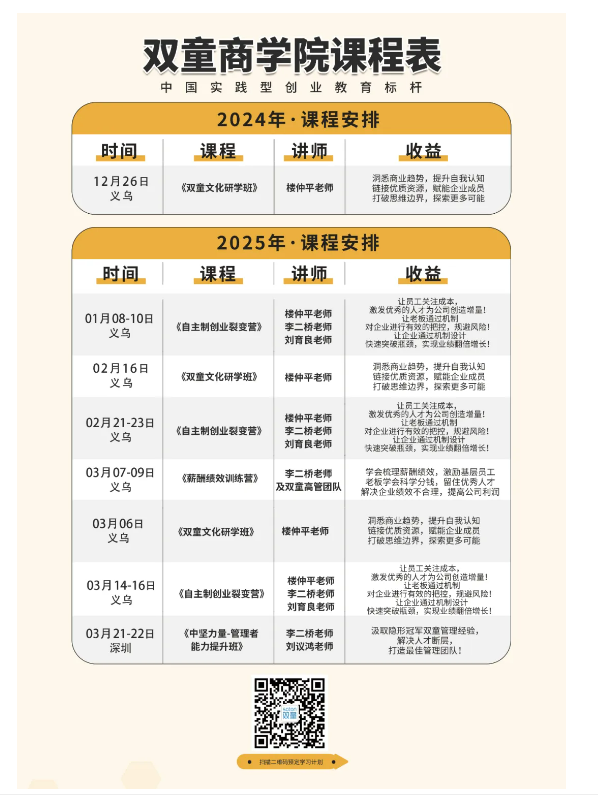 第2425期《自主制創(chuàng)業(yè)裂變營》計劃作為春節(jié)前的收官課程,但很多未報上名的學(xué)員表示,非常希望能在2025年伊始就為自己企業(yè)搭建一個可持續(xù)的激勵機制,以全新的面貌帶領(lǐng)團(tuán)隊發(fā)展,所以在學(xué)員們的學(xué)習(xí)熱情下,雙童商學(xué)院特意增設(shè)了1月8號的《自主制創(chuàng)業(yè)裂變營》!