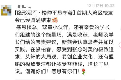 本次大灣區(qū)校友會活動圓滿落幕,隱形冠軍樓仲平思享薈也將不定期舉辦川渝地區(qū)、江浙地區(qū)等校友會活動,通過走進學員企業(yè)研學,加深相互鏈接,將這份源自樓仲平“弟子班”的情誼與溫暖永久地延續(xù)下去!