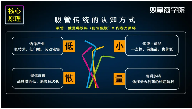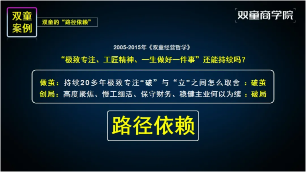 2015年,雙童發(fā)展正如日中天,但創(chuàng)始人樓仲平已經(jīng)隱隱意識到雙童已經(jīng)來到了新的極限點(diǎn)。樓老師還現(xiàn)場播放了一段大約十年前央視《新聞聯(lián)播》報(bào)道雙童的視頻,向大家展示了雙童在吸管行業(yè)的領(lǐng)先地位。但也就是在這段時(shí)期,雙童遇到了行業(yè)“天花板”,創(chuàng)新紅利已經(jīng)開始衰竭,國際禁塑也讓吸管的應(yīng)用場景在大幅減小,行業(yè)越來越內(nèi)卷!《雙童經(jīng)營哲學(xué)》(2015版)中倡導(dǎo)的“極致專注、工匠精神、一生做好一件事”不可持續(xù)!