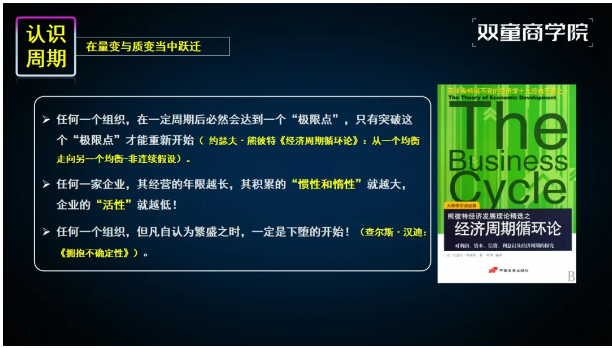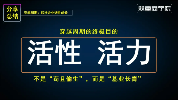 在中小企業(yè)平均壽命不到三年的情況下,企業(yè)正面臨著越來越難的經(jīng)濟(jì)周期,如何讓企業(yè)持續(xù)保持足夠的“活性”和“活力”, 需要?jiǎng)?chuàng)業(yè)者擁有強(qiáng)烈的經(jīng)營“周期意識”,只有認(rèn)識周期,才能防范周期,進(jìn)而帶領(lǐng)企業(yè)穿越周期!