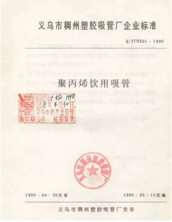 雙童的第一件企業(yè)標(biāo)準(zhǔn)是在1998年4月30日發(fā)布的,也是中國的第一份吸管標(biāo)準(zhǔn)。那時候義烏的小商品普遍以低、小、散、弱為特點,但是雙童沒有隨波逐流,堅持走標(biāo)準(zhǔn)化之路,后來又做了產(chǎn)業(yè)標(biāo)準(zhǔn)、地方標(biāo)準(zhǔn)、國家標(biāo)準(zhǔn),包括國際標(biāo)準(zhǔn)。雙童第一件企業(yè)標(biāo)準(zhǔn),目前已被義烏市博物館收藏展出