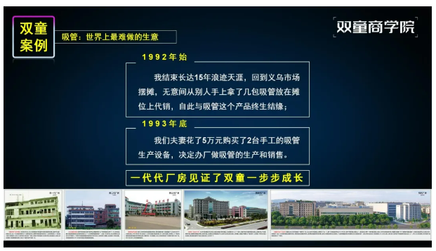 此后六年,雙童創(chuàng)業(yè)平臺成功孵化出了16家創(chuàng)業(yè)體和26個經營體,并創(chuàng)造了3.6倍的業(yè)績增長!形成了以吸管制造業(yè)為基礎,以國際貿易和創(chuàng)業(yè)教育兩大板塊為融合的新型產業(yè)模式,完成了從“一根吸管”到“創(chuàng)業(yè)平臺”的轉變!
