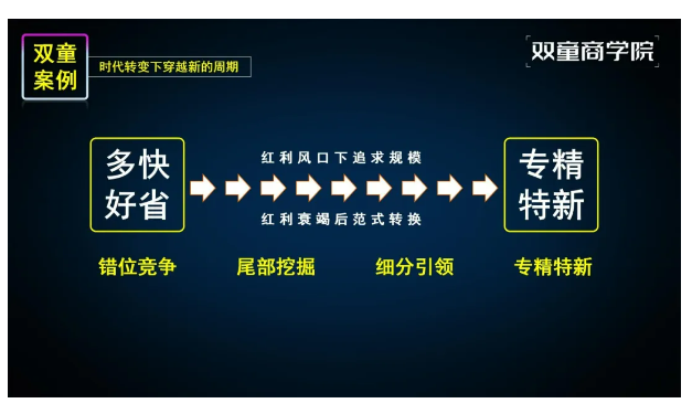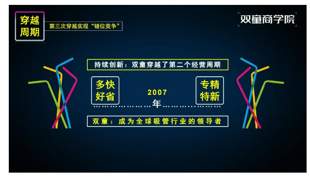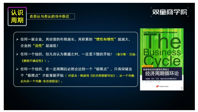 其實,所有的企業(yè)都與雙童一樣,持續(xù)置身于循環(huán)往復的周期之中,不斷跨越一個又一個周期,經歷著無盡的變遷與躍升。這也是創(chuàng)業(yè)者的宿命和悲哀:只有成長,沒有成功!但是,如果已經意識到周期,卻無動于衷的話,其穿越周期的難度會越來越高,最后極有可能被周期所限(老化、死亡)。