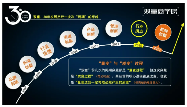 雙童穿越第一個經營周期,完成從作坊企業(yè)到規(guī)范經營的蛻變,得益于意識領先。雙童初創(chuàng)的前十年,創(chuàng)始人樓仲平帶領雙童完成了3次“開門”,進而形成了雙童的品牌體系、標準體系和數字思維。