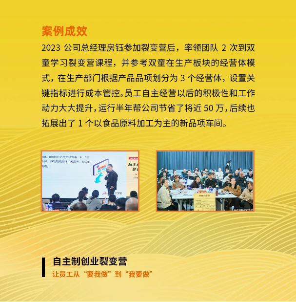這套機制對“雙童”意義重大,創(chuàng)始人樓仲平希望該機制能夠助力更多中小企業(yè)實現(xiàn)組織變革。從2022年開始,第五創(chuàng)業(yè)體雙童商學(xué)院就針對該機制,把“雙童”的落地實操方法與成功經(jīng)驗經(jīng)驗有機結(jié)合打磨成《自主制創(chuàng)業(yè)裂變營》課程。