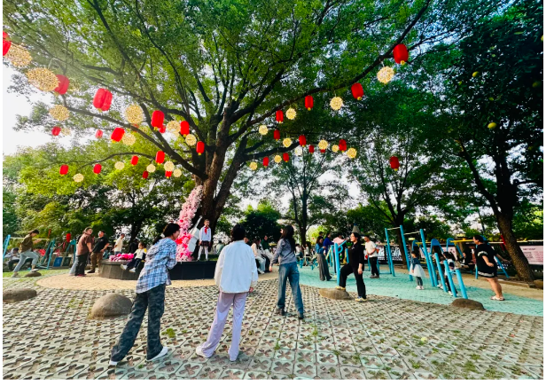 五月份之后,這棵樹的葉子更茂密,樹蔭下這塊地方就成為了我們員工的健身區(qū)。我平時如果來的早的話,有時也會到這里活動,拉個單杠運動一下,特別是周末或者下午下班的時間,這里會聚集很多員工、家屬和小朋友玩耍嬉鬧!