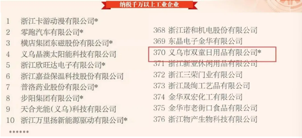 2月12日,義烏市人民政府網(wǎng)公布了“2024年度工業(yè)企業(yè)50強(qiáng)”名單,雙童創(chuàng)業(yè)共享平臺(tái)第一創(chuàng)業(yè)體(雙童日用品有限公司)與2023年蟬聯(lián)同榜同序,位居第32位!