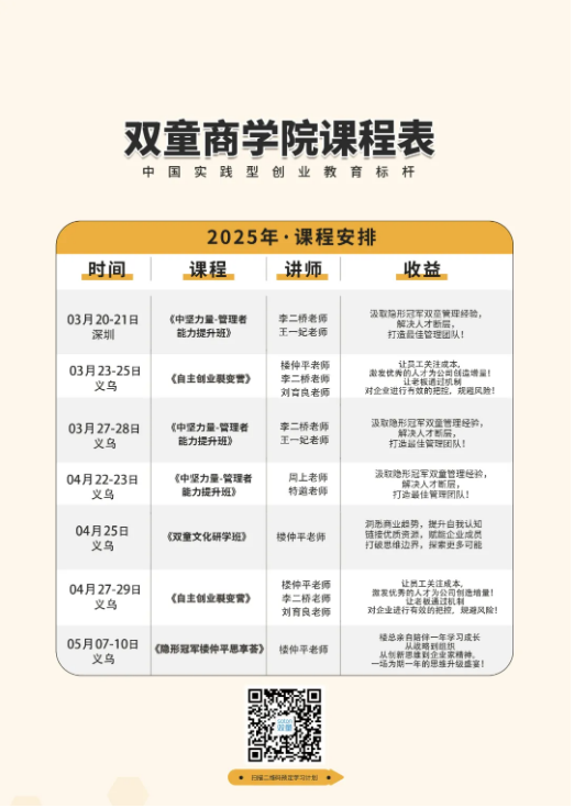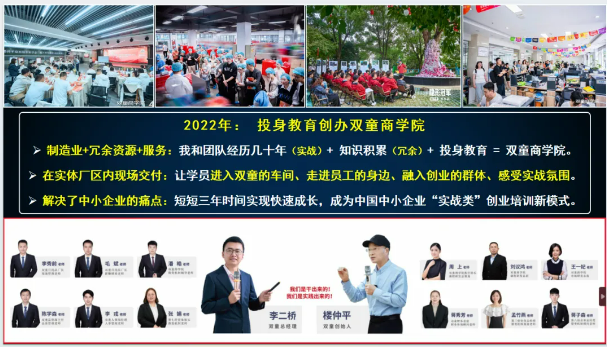 雙童商學(xué)院作為實戰(zhàn)類創(chuàng)業(yè)教育培訓(xùn)的頭部商學(xué)院,以“實戰(zhàn)、實效、實用”為理念,為創(chuàng)業(yè)者提供定制化的培訓(xùn)課程和咨詢服務(wù),助力企業(yè)提升核心競爭力,實現(xiàn)可持續(xù)發(fā)展。