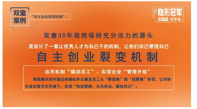 作為中國細分行業(yè)隱形冠軍企業(yè),“雙童”31年持續(xù)的創(chuàng)新和轉(zhuǎn)型,經(jīng)歷了從“作坊企業(yè)—專精特新--隱形冠軍—第二曲線”的全生命發(fā)展周期,更懂得中小企業(yè)在“隱形冠軍”之路中各個階段遇到的痛點、難點。