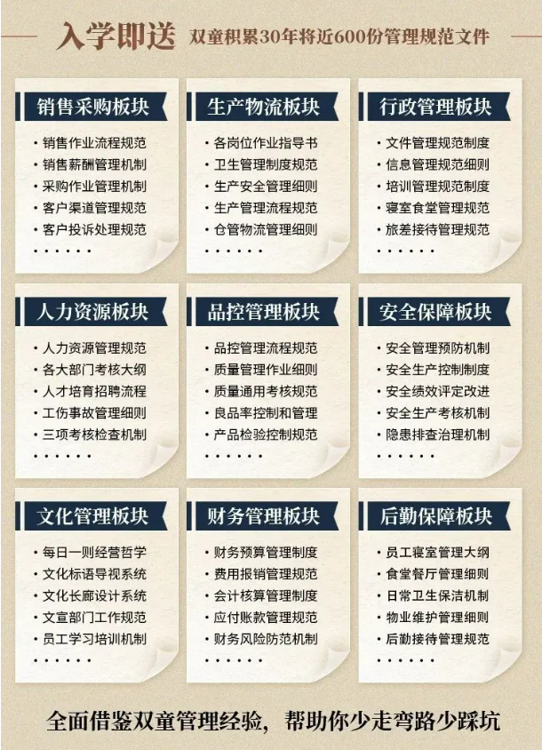 所以,入學(xué)“隱形冠軍樓仲平思享薈”之后,項目組會將“雙童”積累了31年、包含了銷售、生產(chǎn)、行政、人力資源、品控、安全、文化管理、財務(wù)和后勤等9大板塊,近600份管理規(guī)范文件,全部打包給學(xué)員,幫助學(xué)員企業(yè)能夠全面借鑒雙童管理經(jīng)驗、少走彎路、少踩坑!