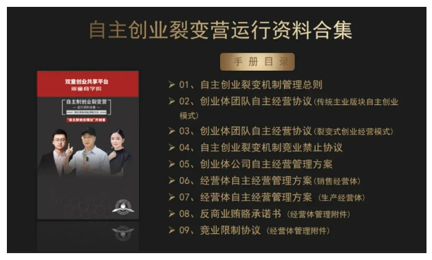 3、交付自主創(chuàng)業(yè)裂變模式的各項規(guī)則、文本、合同等書面資料