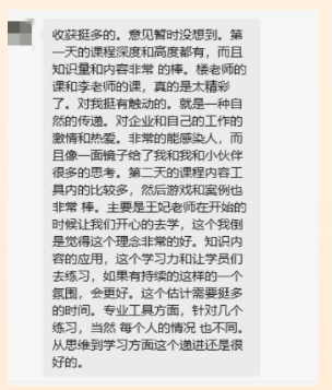 兩天的課程學(xué)習(xí)之后,我們也收到了不少本期學(xué)員的好評(píng)反饋:在學(xué)習(xí)完這門課程后都給出了好評(píng)雙童商學(xué)院選擇走出義烏在深圳開(kāi)設(shè)《中堅(jiān)力量管理實(shí)戰(zhàn)營(yíng)》課程,絕非偶然的市場(chǎng)選擇,而是通過(guò)深思熟慮與企業(yè)發(fā)展剛需的戰(zhàn)略布局。
