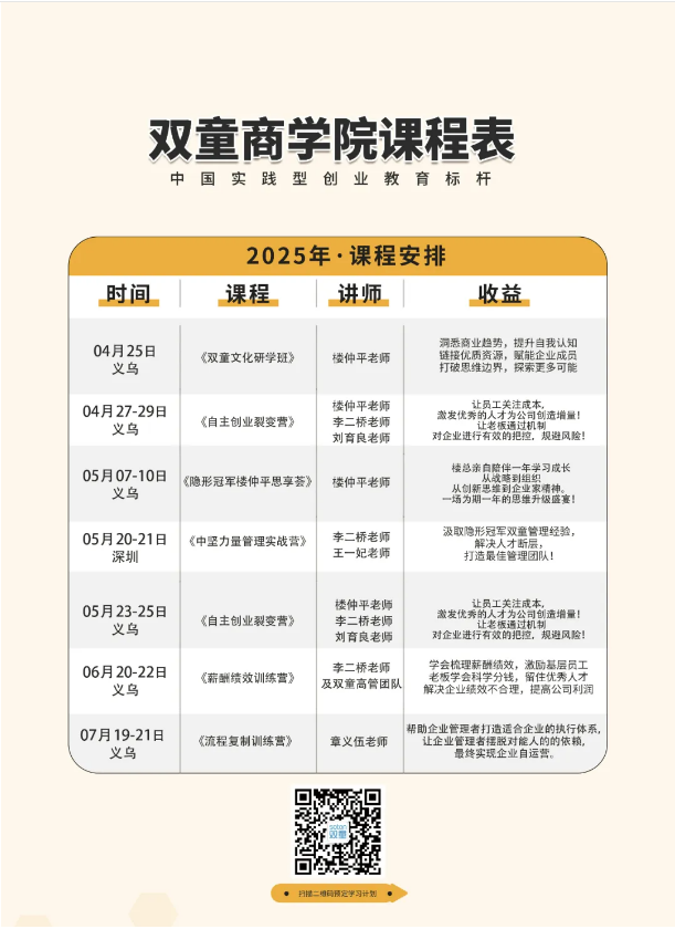 各位中小企業(yè)老板們,如果你也想把自己從大小瑣事中解放出來(lái),也想要一支有活力、強(qiáng)要性的管理團(tuán)隊(duì),該課程學(xué)制為三個(gè)模塊完成交付后贈(zèng)送一次樓仲平年度大課。義烏班第二模塊4月22日-23日,深圳班第二模塊5月20日-21日,循環(huán)開(kāi)班。歡迎到雙童商學(xué)院參加學(xué)習(xí)!