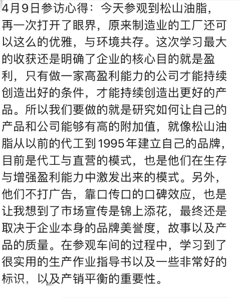 這次參觀松山油脂的富士山工廠,也讓同學(xué)們深刻體會到了松山油脂對產(chǎn)品制造的嚴(yán)謹(jǐn)態(tài)度,同時(shí)更加深入了解日本傳統(tǒng)日化制造業(yè)的發(fā)展和現(xiàn)代管理,學(xué)習(xí)如何在堅(jiān)守傳統(tǒng)的同時(shí),實(shí)現(xiàn)品牌化與市場化發(fā)展。