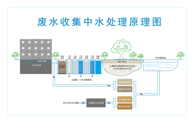 所謂“廢水收集處理循環(huán)回用系統(tǒng)”,就是將員工的生活廢水過(guò)濾后匯聚到“ 雙童一號(hào)樹(shù)”下進(jìn)行生物吸附處理,形成中水,然后再流入景觀池下的中水儲(chǔ)存池中,以便供給廠區(qū)所有衛(wèi)生間的馬桶沖水、綠化噴淋和道路清洗、車輛清洗所用。