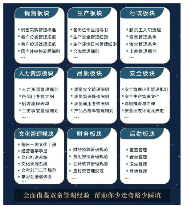 入學“隱形冠軍樓仲平思享薈”之后,你將獲得“雙童”積累了31年、包含了銷售、生產(chǎn)、行政、人力資源、品質、安全、文化管理、財務和后勤等9大板塊,近600份管理規(guī)范文件,可以幫助企業(yè)全面借鑒雙童管理經(jīng)驗、少走彎路、少踩坑!