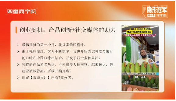 這些獨(dú)具特色的產(chǎn)品以及他使用義烏方言的交流方式,吸引了無數(shù)人前來拍攝視頻,使他的攤位愈發(fā)火爆。然而,這也帶來了城市管理的挑戰(zhàn)。好在義烏市有很好的創(chuàng)業(yè)環(huán)境,城管部門對(duì)其擺攤的行為雖然予以關(guān)注,但并沒有暴力驅(qū)逐,最終還幫助他辦理營(yíng)業(yè)執(zhí)照,開起了一家能夠正常運(yùn)轉(zhuǎn)的果汁店。