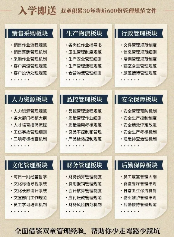 所以,入學(xué)“隱形冠軍樓仲平思享薈”之后,項(xiàng)目組會(huì)將“雙童”積累了31年、包含了銷售、生產(chǎn)、行政、人力資源、品控、安全、文化管理、財(cái)務(wù)和后勤等9大板塊,近600份管理規(guī)范文件,全部打包給學(xué)員,幫助學(xué)員企業(yè)能夠全面借鑒雙童管理經(jīng)驗(yàn)、少走彎路、少踩坑!