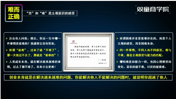 作為擁有47年創(chuàng)業(yè)史的創(chuàng)業(yè)老兵,樓仲平老師對于“苦難”始終有自己的觀點:他認(rèn)為困難并非是客觀存在的,而是個人主觀的感受,而非困難本身。創(chuàng)業(yè)本身就是在解決越來越難的問題,你能解決他人不能解決的問題時,就說明你超越了他人。