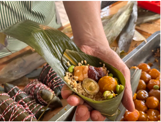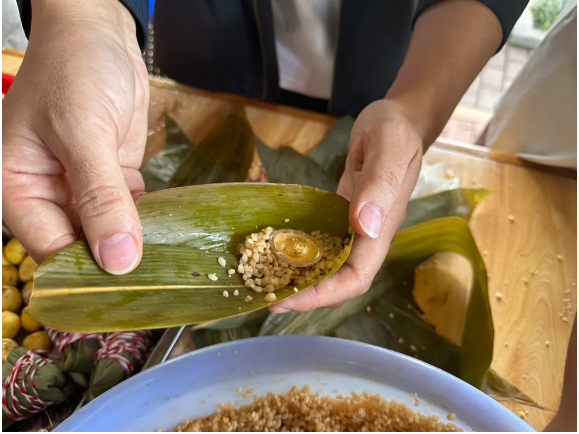 重頭戲來啦,黃金元寶餡料已就位!大家一起目睹它們被包進香糯米里,可惜時間太短,完全記不住這幾個粽子的外貌特征就已經(jīng)要開始煮了。
