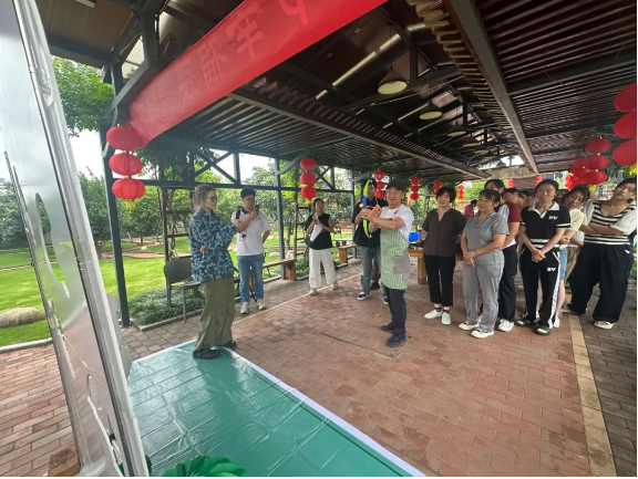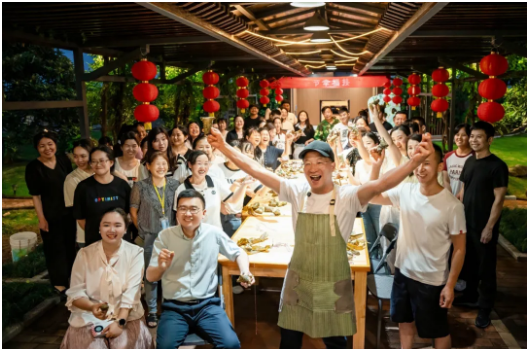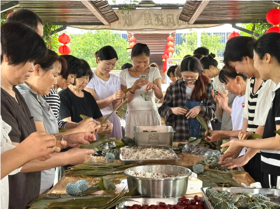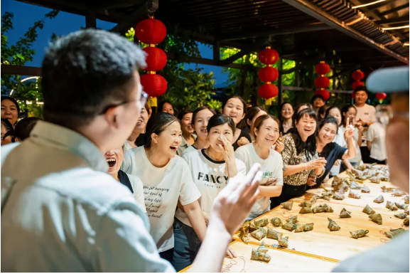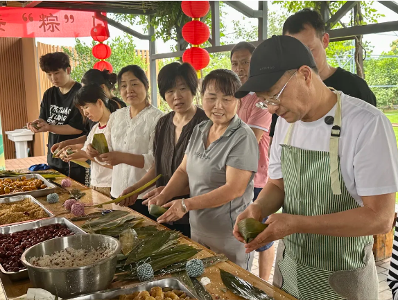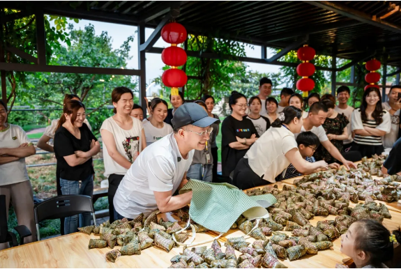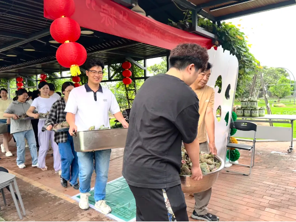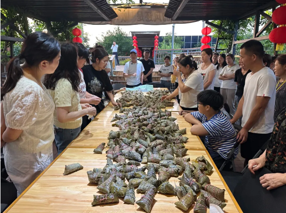 由于各個崗位的年輕人都沒有親自做過粽子,手忙腳亂地做出來的粽子始終不成型。樓總便趕忙邀請了他的幾位親戚過來做“指導老師”,現(xiàn)場手把手傳承包粽子手藝。