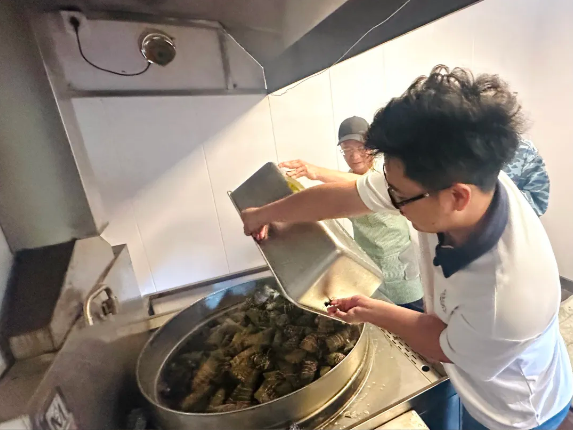一千多個粽子被裝進了十幾個框子里,這分量可不小,不管男同胞女同胞,一齊上陣將它們抬到廚房里。