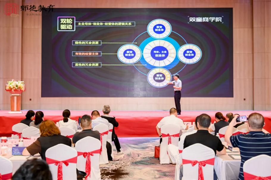 于是,創(chuàng)始人樓仲平開始帶領(lǐng)“雙童”突破“一根吸管”的局限,開始對組織機(jī)制進(jìn)行組合和創(chuàng)新,結(jié)合阿米巴、自主經(jīng)營、內(nèi)部創(chuàng)客和《公司法》的優(yōu)勢,制定了《自主創(chuàng)業(yè)裂變機(jī)制》,鼓勵員工自主創(chuàng)業(yè),尋找新的增長點(diǎn),并在2018年通過《自主創(chuàng)業(yè)裂變機(jī)制》搭建了創(chuàng)業(yè)共享平臺,以激發(fā)更多員工的積極性和創(chuàng)造性!該機(jī)制通過搭建內(nèi)部創(chuàng)業(yè)共享平臺,不僅激活了組織內(nèi)冗余的資源與能力,更在二次流轉(zhuǎn)中創(chuàng)造了新的協(xié)同價值,從而在降低邊際成本的同時,為企業(yè)和內(nèi)部創(chuàng)業(yè)者構(gòu)建了可持續(xù)的雙贏增長模式。樓總通過“雙輪驅(qū)動”模型,向在座企業(yè)家系統(tǒng)闡釋了“主業(yè)母體-創(chuàng)業(yè)體-經(jīng)營體”的邏輯閉環(huán):主業(yè)母體作為根基持續(xù)賦能并孵化裂變創(chuàng)業(yè)體;借助自主創(chuàng)業(yè)裂變機(jī)制,將人才、技術(shù)、供應(yīng)鏈能力等隱性冗余資源利用起來。