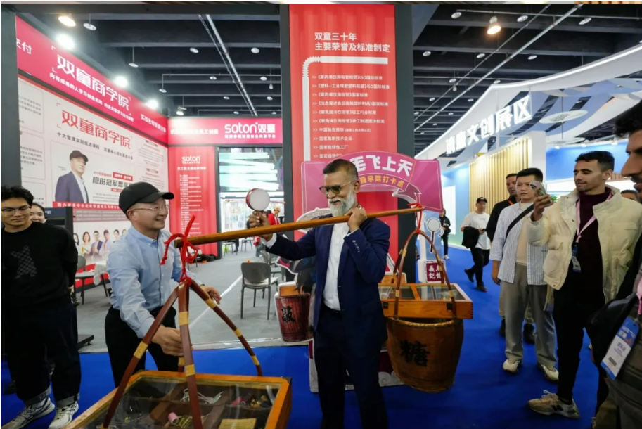 展會現場,雙童董事長樓仲平親自挑起貨郎擔,重現"雞毛換糖"的歷史場景,將義烏深厚的商業(yè)傳統與當代展會完美融合。隨著撥浪鼓聲響起,各國客商紛紛駐足,踴躍參與這場跨越時空的體驗,在互動中感受義烏商業(yè)精神的傳承與創(chuàng)新。
