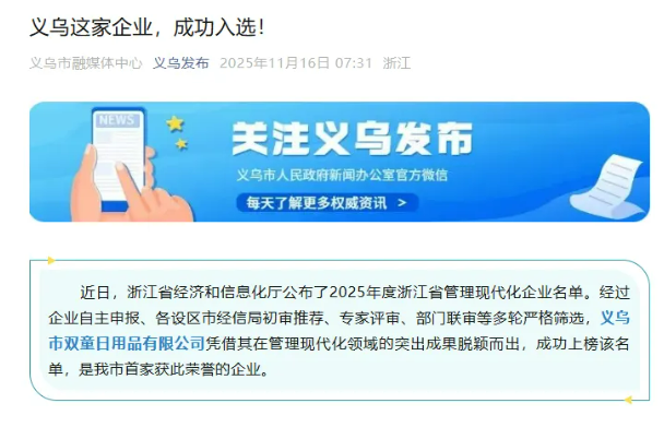 近日,義烏市雙童日用品有限公司成功入選“2025年度浙江省管理現(xiàn)代化企業(yè)”,成為義烏市首家獲此榮譽(yù)的企業(yè)。該消息由《義烏發(fā)布》隆重報道!