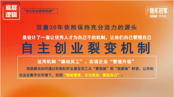 然而,傳統(tǒng)管控模式難以適應(yīng)新階段需求,而市面上成熟機(jī)制多基于大企業(yè)邏輯,無法直接適用于雙童。面對核心員工流失與資源閑置的雙重困境,他基于“以機(jī)制撬動人效”的思路,在數(shù)字化環(huán)境下創(chuàng)新組織架構(gòu),探索出《自主創(chuàng)業(yè)裂變機(jī)制》,開展了一場立足中國中小企業(yè)現(xiàn)實(shí)的組織創(chuàng)新實(shí)踐。
