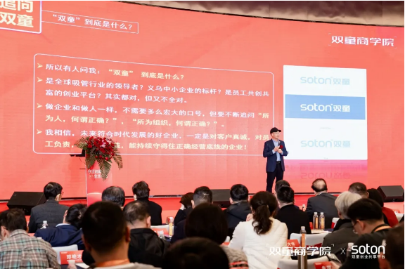 愿景,“打造共同富裕的共創(chuàng)平臺,做有利于社會的好企業(yè)”,以創(chuàng)造廣泛的社會價值為根本宗旨,通過構(gòu)建開放包容的賦能平臺,致力于促進包括物質(zhì)、能力、機會在內(nèi)的全方位“共同富?!薄?/span> 核心價值觀,“致力成長,協(xié)同共生”,這八個字凝聚了雙童的發(fā)展智慧。致力成長要求組織與個人保持持續(xù)進化;協(xié)同共生則主張在與各方關(guān)系中尋求共贏,在利他中實現(xiàn)可持續(xù)發(fā)展。 這三個維度的相互支撐構(gòu)成了雙童三十余年實踐中沉淀出的經(jīng)營哲學(xué),為企業(yè)從傳統(tǒng)制造向共享平臺轉(zhuǎn)型提供了根本指引,也為中小企業(yè)的可持續(xù)發(fā)展提供了可借鑒的實踐路徑。 樓仲平老師闡述《雙童經(jīng)營哲學(xué)》的核心綱要 樓仲平老師總結(jié)道,經(jīng)營的終極修行存在于具體的事與問題之中,其底層邏輯正是對“何為正確”的不斷探尋與實踐。而“何為正確”沒有終極答案,它存在于持續(xù)為社會創(chuàng)造價值、追求更多人幸福的每一個行動之中。 樓仲平老師對雙童作出解讀