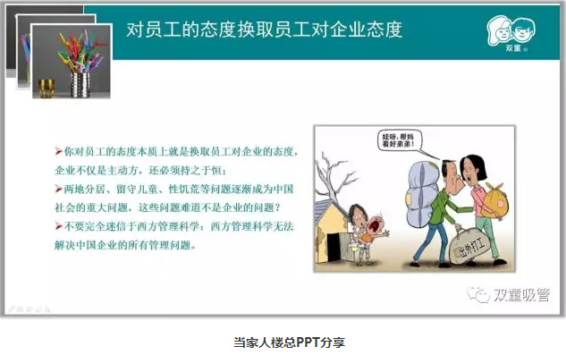 一開場,大家對雙童家文化很感興趣!當(dāng)家人樓總首先和大家介紹了家文化雙童的應(yīng)用及實踐效益。“家”是員工最大的牽掛,解決了員工的問題,他們才能全身心投入到工作當(dāng)中,人心管理就是企業(yè)生態(tài)系統(tǒng)的改善。“雙童”明確把“家文化”作為員工管理的著力點,以“小家”形成“大家”,凝聚團(tuán)隊“人心”!