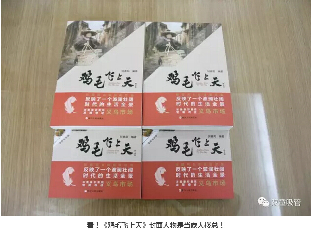 大家一定會發(fā)現(xiàn)書上有個亮點,看,《雞毛飛上天》同名小說的封面人物是我們的當家人樓總呢!