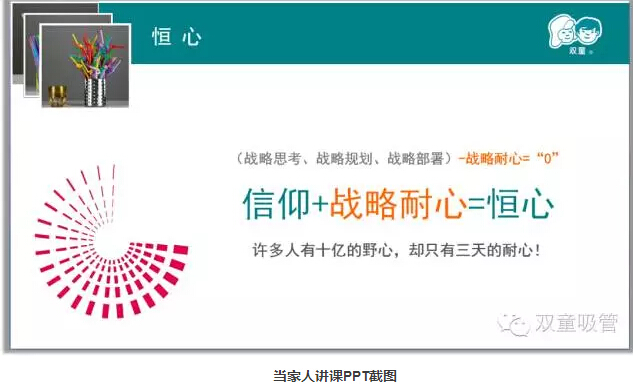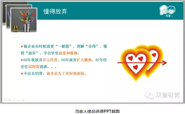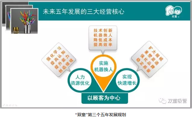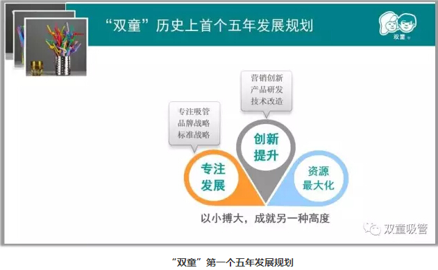 “雙童堅持走專業(yè)化的發(fā)展道路,堅守實業(yè),不多元,不浮躁,不急功近利,強調(diào)以小博大,不是拼搏的搏,而是博大的博,就是要以博大的胸懷將一根吸管做精、做強、做到極致。