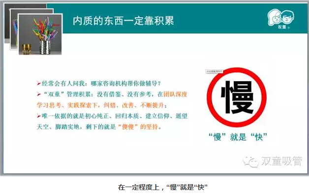 “雙童也是一樣,不斷地積累。在團隊深度學(xué)習(xí)思考、實踐探索下,糾錯、改善、不斷提升。除了初心純正、回歸本質(zhì),腳踏實地之外,剩下的就是傻傻的堅持。不要嫌自己走得太慢,走的慢才可深入積累做更長!在一定程度上,其實就是。