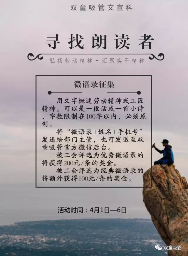 前段時(shí)間,義烏市總工會(huì)舉辦了弘揚(yáng)勞動(dòng)精神·匯聚實(shí)干力量尋找朗讀者活動(dòng),征集以勞動(dòng)精神、勞模精神或工匠精神為主題的微語錄。吸管妞一看到此次活動(dòng),就覺得這樣的活動(dòng)太適合雙童人啦,立馬就報(bào)名啦!