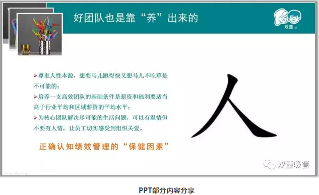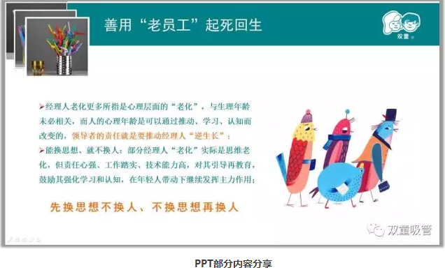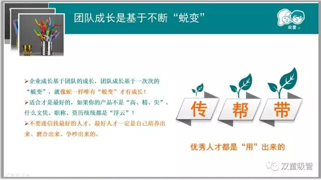 接下來(lái)“雙童”樓仲平也分享了“雙童”團(tuán)隊(duì)的成長(zhǎng)也是基于不斷地蛻變,在“雙童”,“傳幫帶”已經(jīng)是最主要的人才培育方式。我們相信,優(yōu)秀人才都是“用”出來(lái)的,只有唯才是用、授權(quán)徹底、目標(biāo)管理,才能夠使管理者真正發(fā)揮自己的作用,為企業(yè)做最大價(jià)值的貢獻(xiàn)。就拿“雙童”進(jìn)出口公司的總經(jīng)理來(lái)講,從清華畢業(yè),有著屬于自己的老板夢(mèng),樓仲平在認(rèn)定其能力后支持1500萬(wàn),給對(duì)方33%股份,實(shí)現(xiàn)了他的老板夢(mèng),實(shí)現(xiàn)共贏!