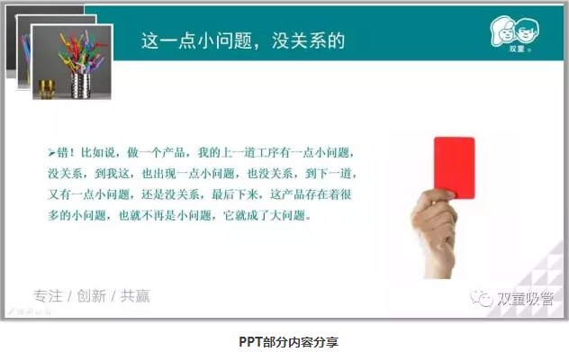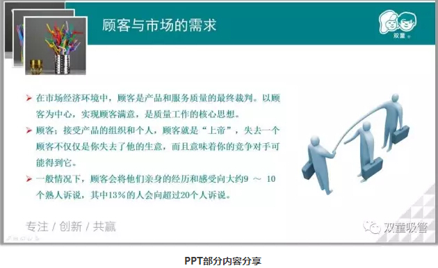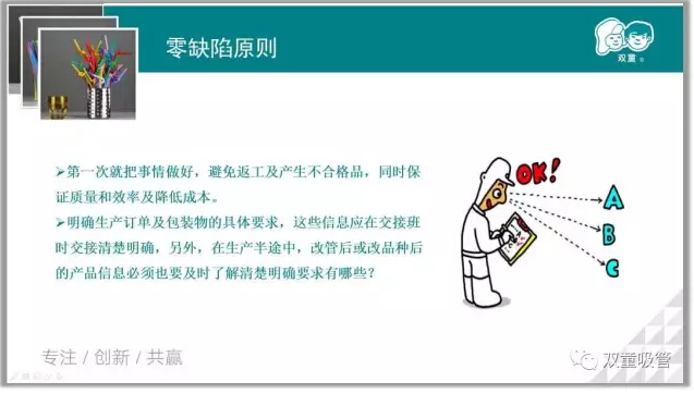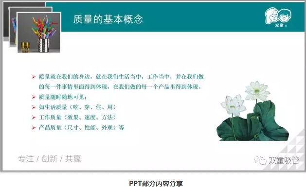一開(kāi)場(chǎng),陳講師先介紹了質(zhì)量的定義以及質(zhì)量管理的發(fā)展史,問(wèn)及“雙童”的質(zhì)量方針時(shí),童鞋們都回答的異口同聲:“支支見(jiàn)品、杯杯見(jiàn)質(zhì);打造“雙童”品牌、提升顧客滿意。”