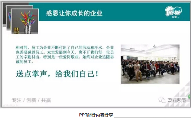 接下來,吸管妞進(jìn)行了“實(shí)踐感恩之心”的主題分享,企業(yè)為我們提供了穩(wěn)定的薪水,解決了衣、食、住、行等生存所需,它使我們實(shí)現(xiàn)了經(jīng)濟(jì)上的安全,有了穩(wěn)定的工作,給我們提供了平臺(tái)和機(jī)會(huì)……說到這里,童鞋們的掌聲紛紛響起,感謝“雙童”,讓我們成長(zhǎng)!