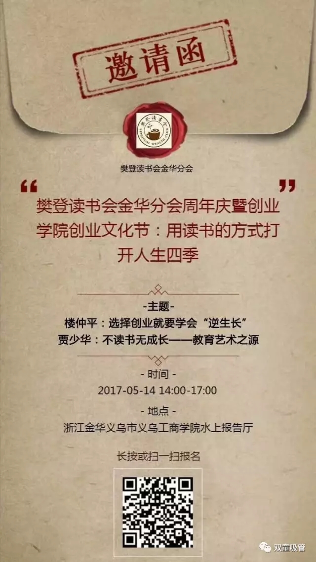 當然,如果你也對樊登讀書會有興趣,或者還有些許猶豫和疑問,沒關系!吸管妞送上驚喜福利,誠摯邀請大家免費參與514日(本周日)在義烏工商學院水上報告廳舉辦的樊登讀書會金華分會成立一周年慶典活動,我們雙童樓仲平也會參與盛典,與義烏工商學院賈少華院長進行專場分享!如果你是樓總的粉絲,更要參加此次盛會哦?。?/span>識別圖中二維碼即可線上報名哦!)