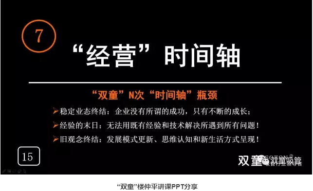 “經(jīng)營”時間軸:樓仲平也用“雙童”的發(fā)展史告訴大家經(jīng)營也是有時間軸的,會遇到瓶頸和“天花板”。企業(yè)沒有所謂的成功,只有不斷的成長,我們無法用既有經(jīng)驗(yàn)和技術(shù)解決所遇到所有問題!