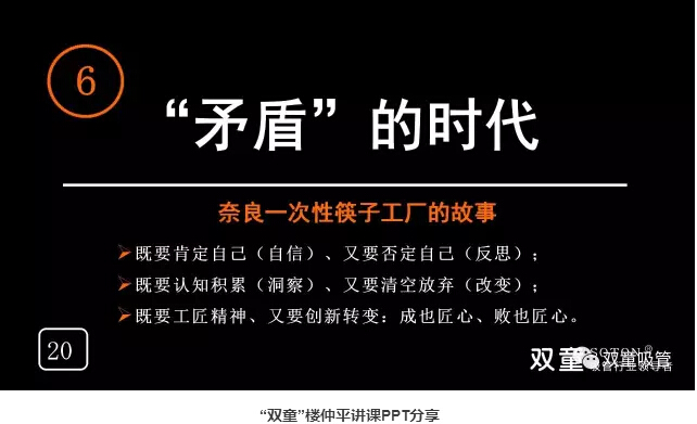 “矛盾”的時代:“雙童”樓仲平通過日本奈良一次性筷子的故事告訴大家成也工匠精神、敗也工匠精神,沒有改變,“工匠”精神也沒有用。作為創(chuàng)業(yè)者來講,我們不能用過往的經(jīng)驗(yàn)來理解發(fā)生的一切,否則你會被時代所拋棄。在不同的時代,你對時間和技術(shù)進(jìn)步的理解是不一樣的,既要肯定自己、又要否定自己;既要認(rèn)知積累、又要清空放棄;既要工匠精神、又要創(chuàng)新轉(zhuǎn)變!