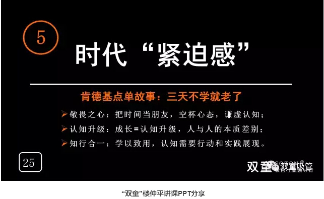 時代“緊迫感”:“雙童”樓仲平在時隔幾天去肯德基時,發(fā)現(xiàn)肯德基已經(jīng)在自助點(diǎn)單了,而自己還在傻傻的等工作人員點(diǎn)餐!這也告訴我們要不斷地學(xué)習(xí),三天不學(xué)你就老了!舊觀念終結(jié),發(fā)展模式層出不窮,新的生活方式不斷呈現(xiàn),行業(yè)變化之快,超出想象,如果你不學(xué)習(xí)就要被淘汰,你就“老了”!