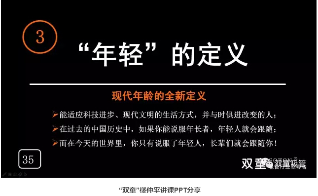 “年輕”的定義:能適應(yīng)現(xiàn)代全新的生活方式,并與時俱進(jìn)的人就是年輕人!在過去的中國歷史中,如果你能說服年長者,年輕人就會跟隨;而在今天的世界里,你只有說服了年輕人,長輩們就會跟隨你!